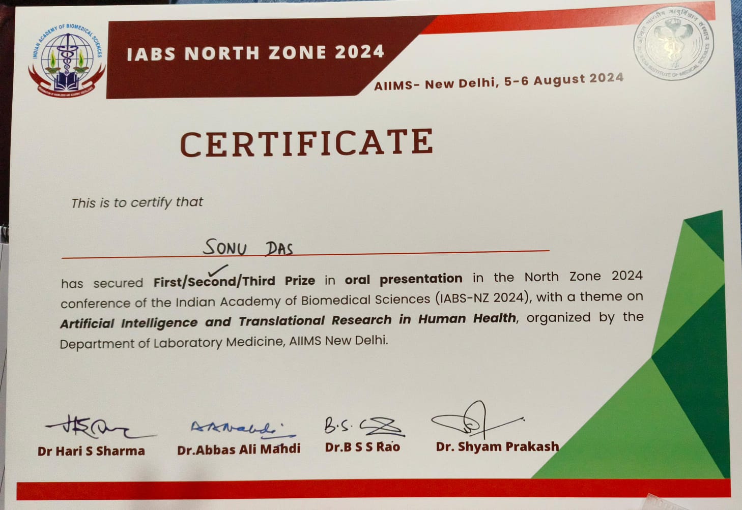 Second prize in oral presentation in the north zone 2024 conference of the indian academy of biomedical sciences ( IABS-NZ 2024) at AIIMS New Delhi